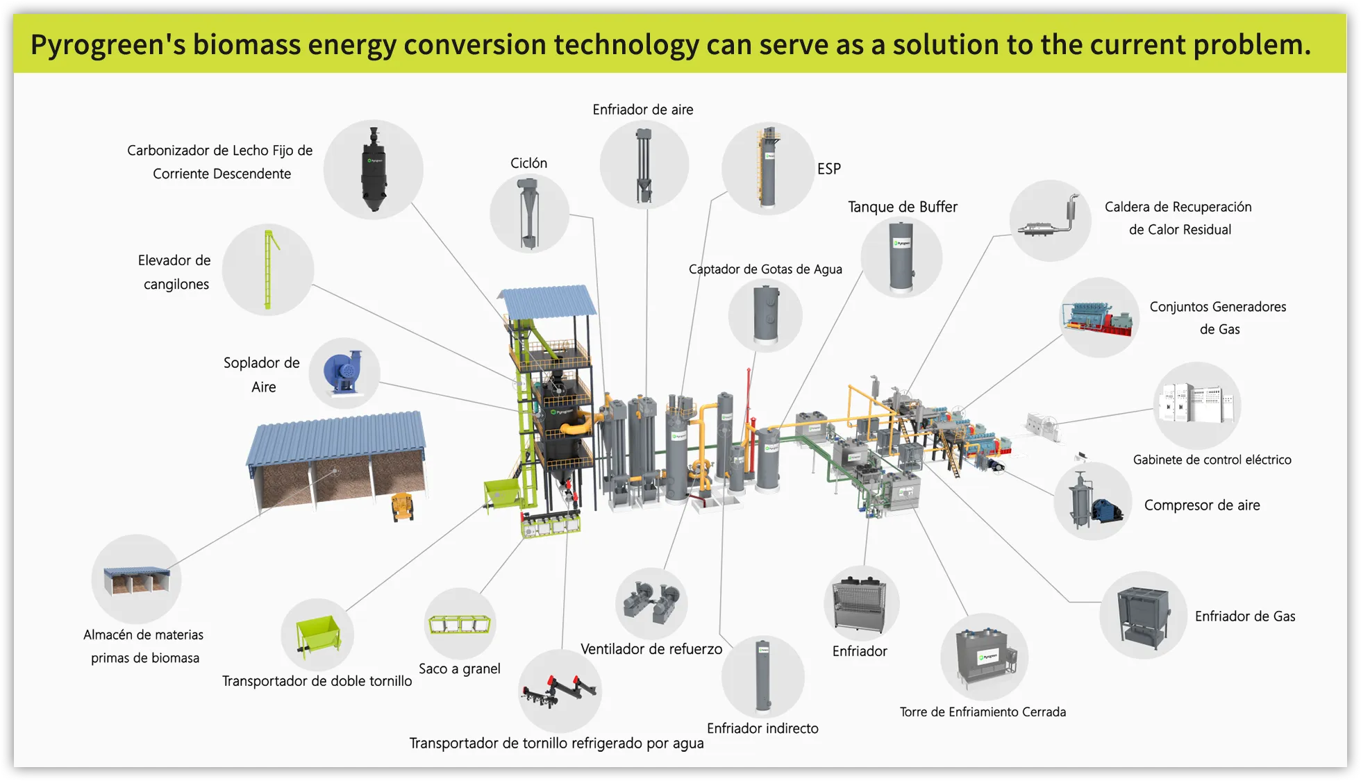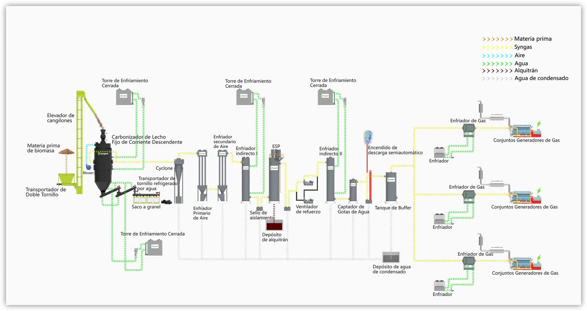 Los desechos agrícolas y forestales como astillas de madera, bloques de paja, astillas de bambú, mazorca de maíz, cáscara de coco, combustible de pellets de biomasa y otra biomasa sufren una reacción de pirólisis y gasificación en el gasificador con suministro de oxígeno pobre, produciendo gas combustible y biocarbón. Luego se utiliza como combustible en un motor de gas para generar electricidad. El biocarbón se utiliza en nuestra vida diaria, en la producción industrial y agrícola.