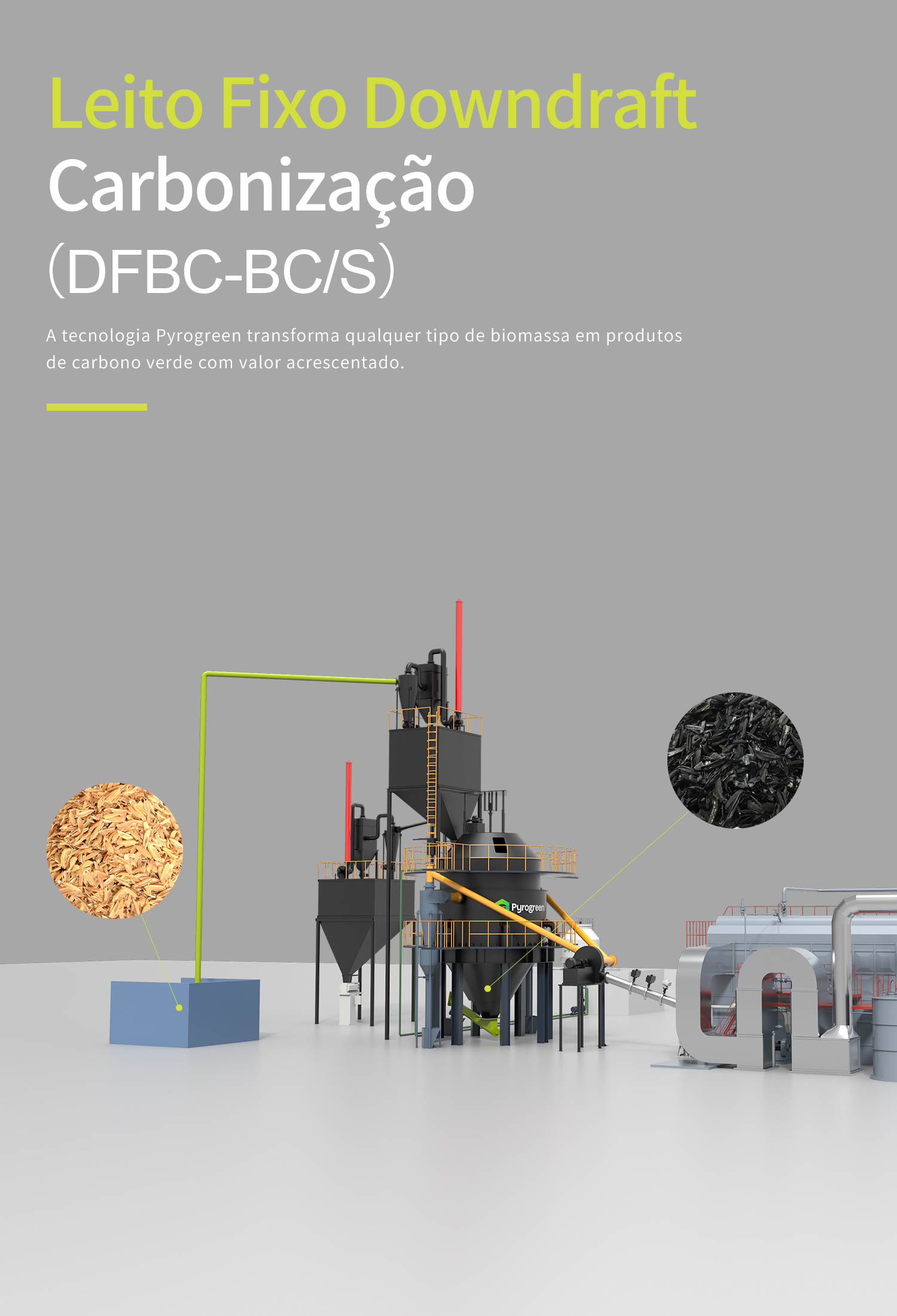 El sistema de calentamiento y co-producción de carbón de cascarilla de arroz de gasificador de biomasa Pyrogreen (Cascarilla de arroz) incluye: sistema de alimentación de materiales, sistema de carbonización (material fino), quemador, sistema de caldera de calor residual, sistema de tratamiento de gases de escape, etc. El principio de funcionamiento es que la biomasa (como la cascarilla de arroz, pajas, bagazo, cáscaras de maní y cáscaras de semillas de girasol, etc.) tienen reacciones de pirólisis y gasificación con oxígeno limitado en el gasificador y generan gas combustible. El gas entra directamente en el horno aislado térmicamente y luego produce gases de escape calientes que se convierten en vapor o agua caliente después de la caldera de calor residual para uso civil e industrial.