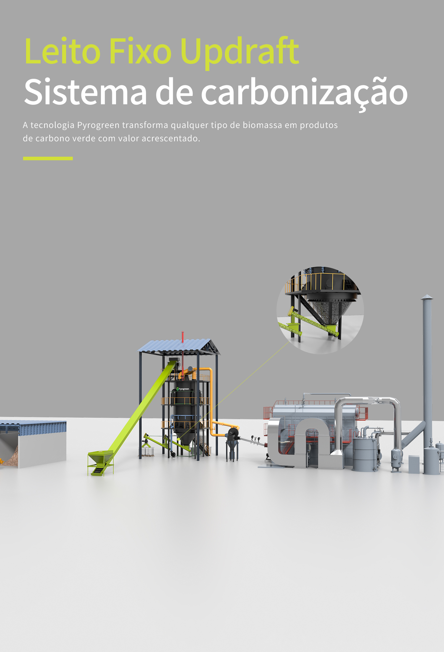El carbonizador de lecho fijo de biomasa de corriente ascendente es una máquina que convierte la biomasa como astillas de madera, astillas de bambú, cáscara de coco, cáscaras de frutas, en biochar y gas combustible en una atmósfera de oxígeno escaso, que podría ser conducido a un sistema de suministro de calor como combustible de gas.