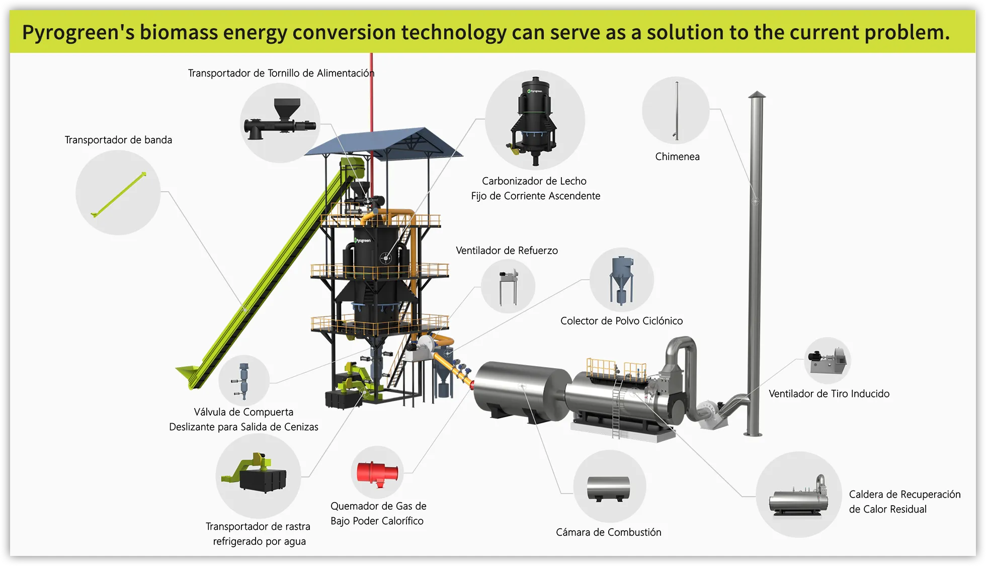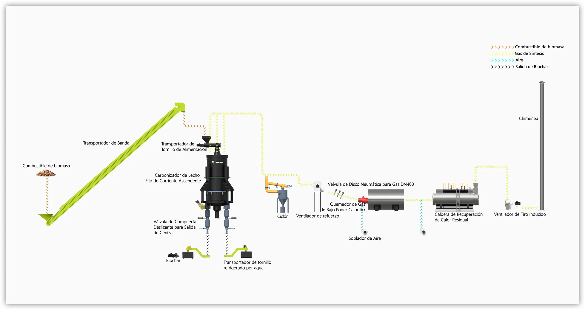 Los residuos agrícolas y forestales como astillas de madera, bloques de paja, astillas de bambú, mazorca de maíz, cáscara de coco, combustible de pellets de biomasa y otra biomasa se someten a una reacción de gasificación por pirólisis en el gasificador con suministro de oxígeno pobre, produciendo gas combustible y biocarbón. El gas combustible convertido de la biomasa se canaliza directamente y se quema en el horno adiabático para producir gases de combustión calientes cuyo calor se intercambia en una caldera de recuperación de calor para producir vapor (agua caliente) para uso residencial o industrial. El biocarbón se utiliza en nuestra vida diaria y en la producción industrial y agrícola.